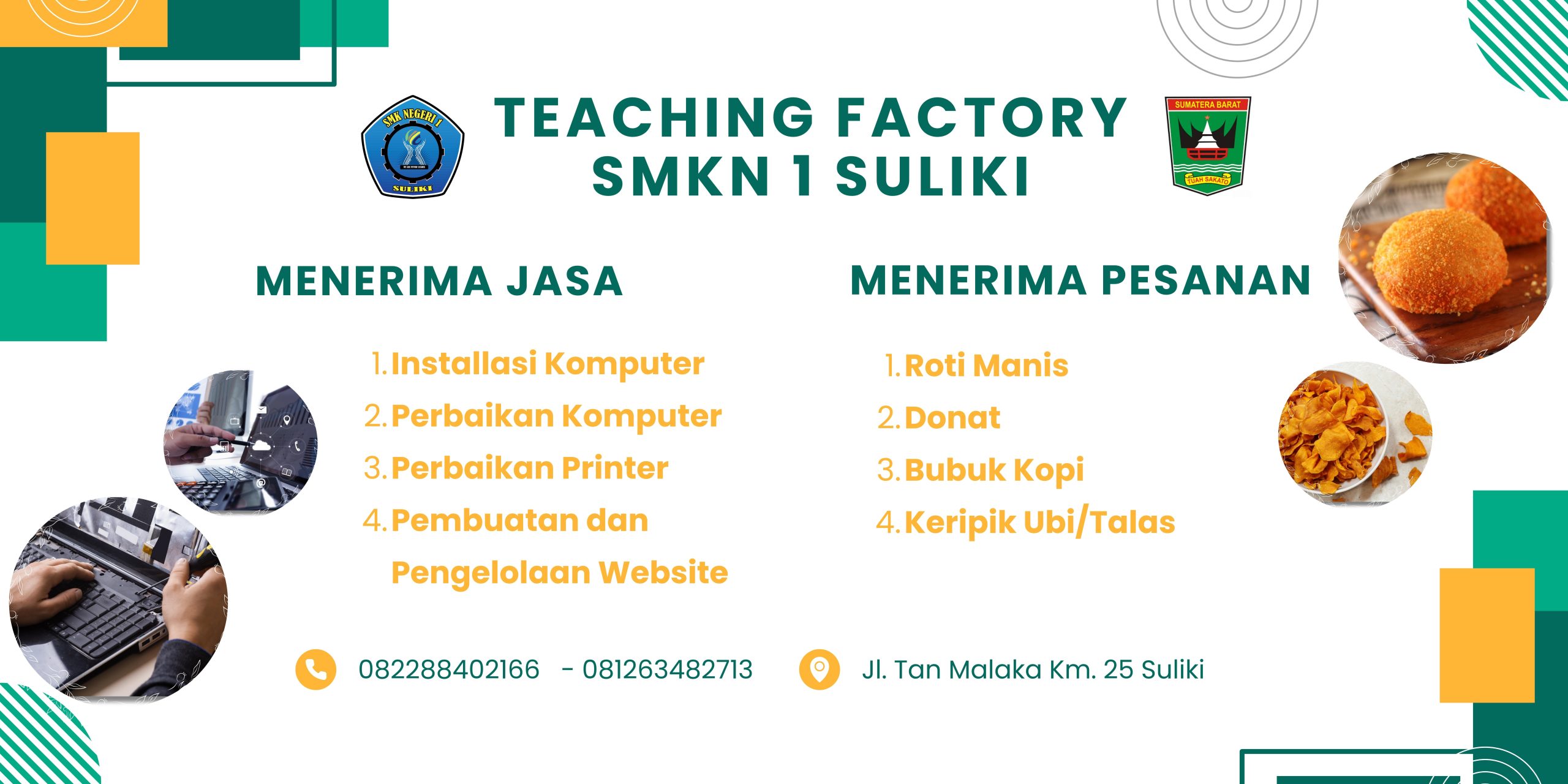 Teaching Factory (Tefa) SMK Negeri 1 Suliki adalah program pembelajaran berbasis produksi dan jasa yang mengintegrasikan dunia pendidikan dengan dunia industri. Melalui Tefa, siswa tidak hanya belajar teori di kelas, tetapi juga menerapkannya langsung dalam kegiatan nyata yang menghasilkan produk dan layanan bermanfaat bagi masyarakat.